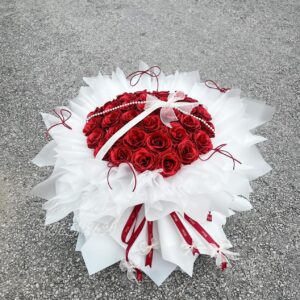 Đây là mẫu hoa hồng nhũ đỏ được cắm tròn bởi 35 bông mic với giấy trắng xung quanh. Bó hoa này có kích thước cả giấy là cao 50 cm rộng ngang 60 cm. Bó hoa phù hợp tặng vào dịp sinh nhật lễ Tết…