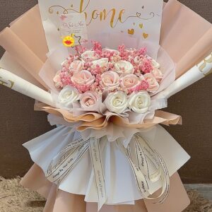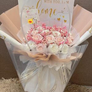 Bó hoa sáp 22 bông hồng nhạt mix hoa baby hồng phấn