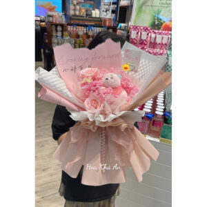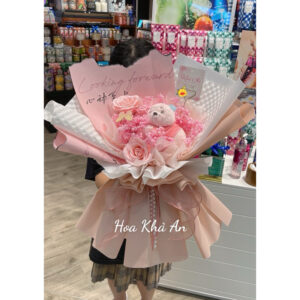 Bó hoa gấu dâu ngủ siêu cute, Mix hoa sáp cao cấp và bi sấy xịn