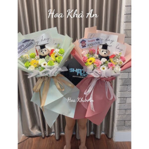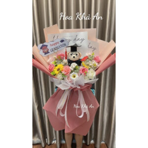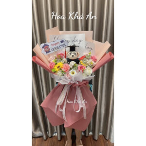 - Thiết kế đáng yêu: Gấu tốt nghiệp được đặt giữa bó hoa, tạo nên điểm nhấn ngộ nghĩnh và dễ thương.