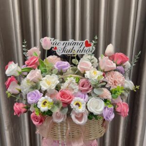Lẵng hoa sinh nhật này được cắm toàn bộ là hoa sáp và hoa lụa cao cấp, nên lưu ý với quý khách là lẵng hoa sinh nhật này rất kỵ nước nhé